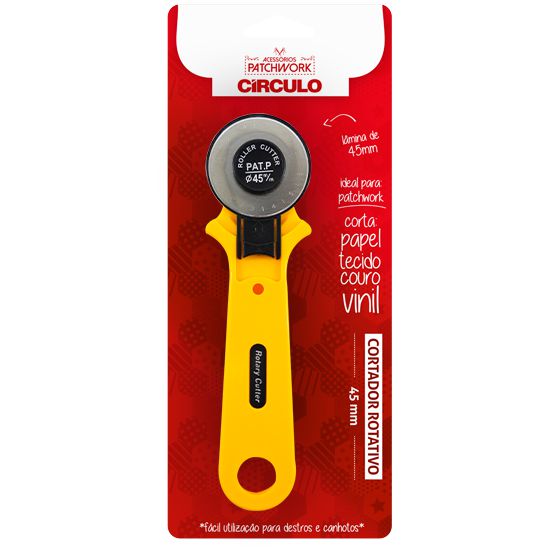 Cortador rotativo com cabo plástico e lâmina de aço, fácil de utilizar e com corte preciso. Ideal para tecidos, papel, couro e vinil.