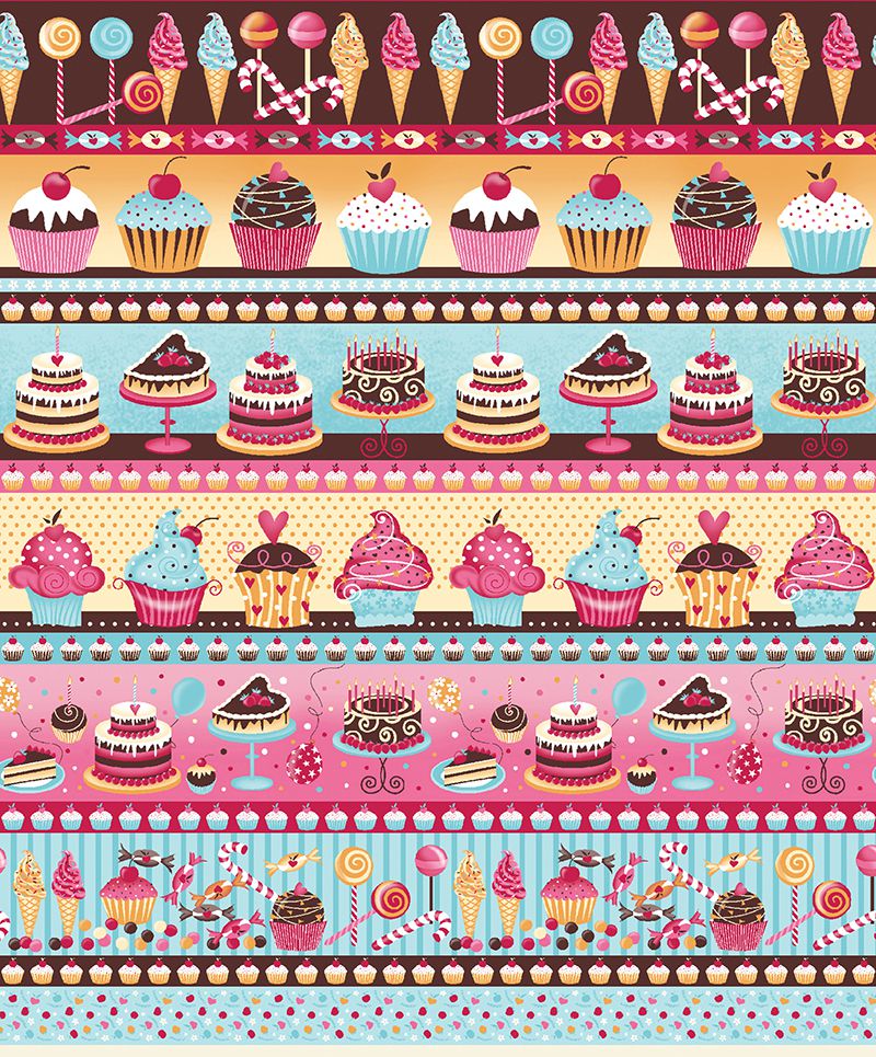 Tecido Tricoline Barrado Bolos e Cupcakes, 50cm x 1,50mt